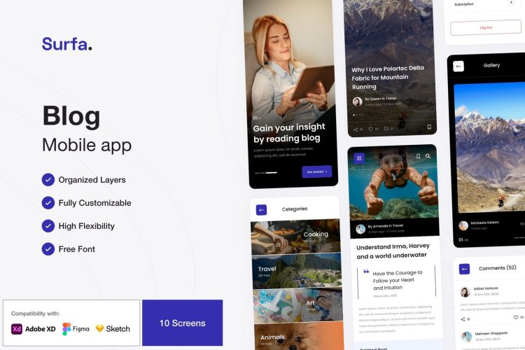 Surfa is a modern and clean Blog & News Mobile App UI Kit created especially for lifestyle bloggers, fashion bloggers, food bloggers, travelers who love to blog, and creative folks who love to write.