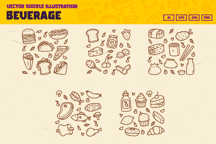 Ilustrasi pola doodle Minuman, Makanan, Makanan cepat saji ini akan sangat cocok untuk poster, header situs web, landing page, aplikasi, presentasi, banner, infografis, media sosial, materi cetak, dan keperluan ilustrasi Makanan dan Minuman lainnya.