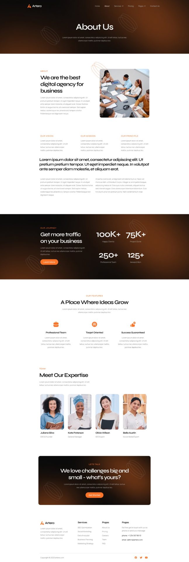 Artera is a modern SEO & Digital Agency Elementor Template Kit that perfect for creating a website for SEO & Digital Agency that specialized in Digital Agency. This template has a trend-forward and unique design with a 100% responsive layout, retina-ready, and very easy to customize using Elementor.